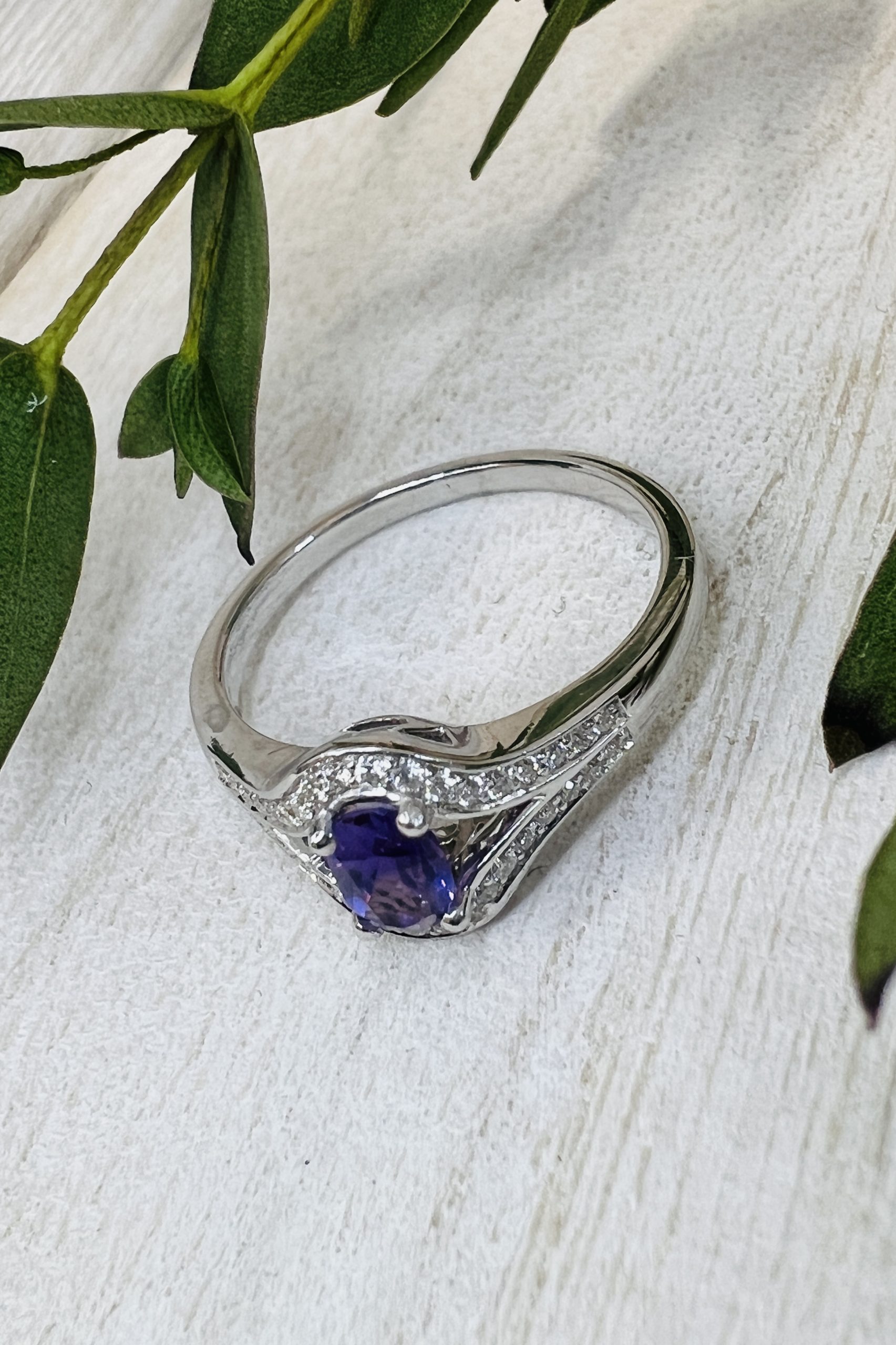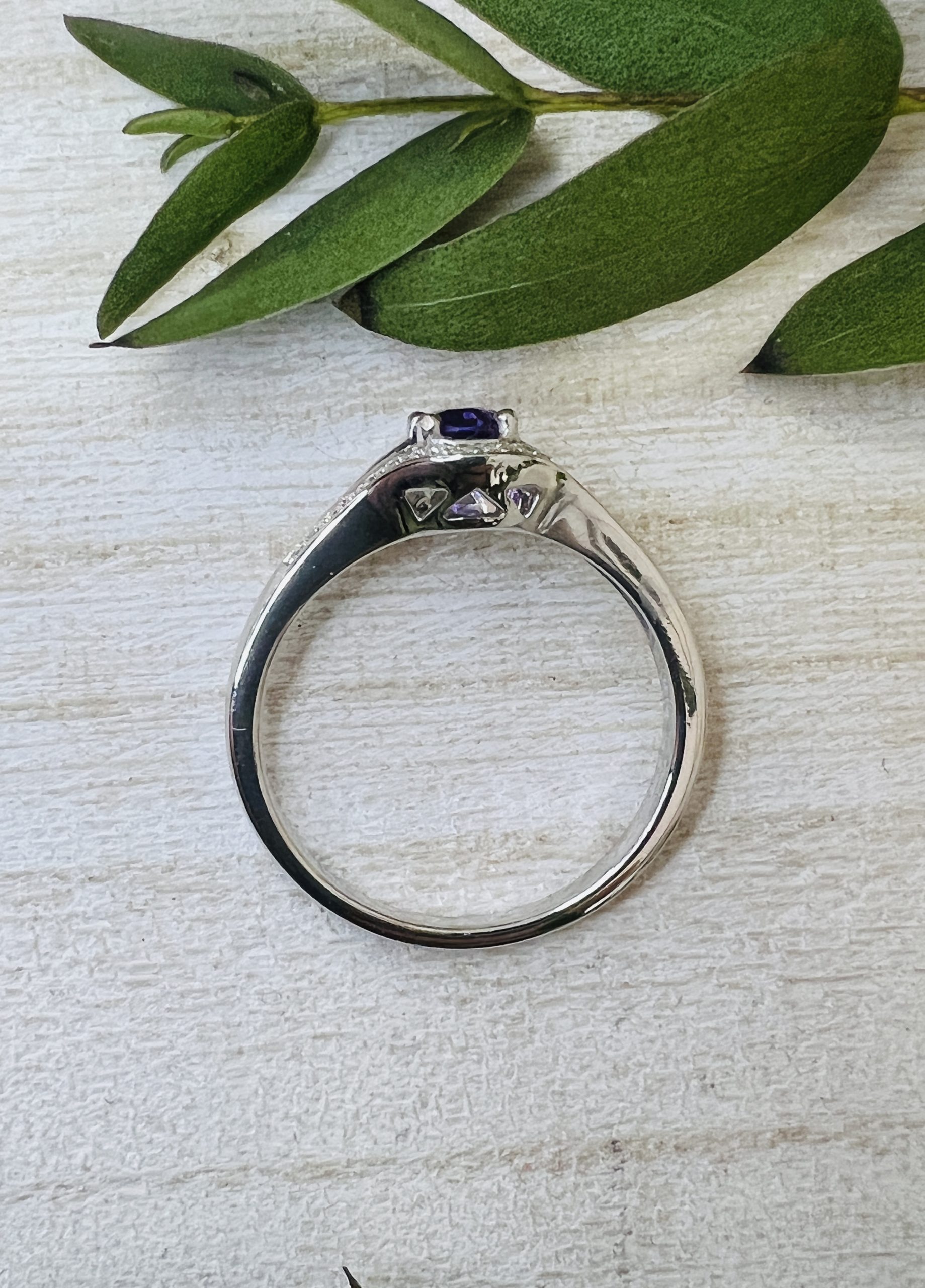 The centre stone is a beautiful vivid oval cut amethyst stone which measures 6mm by 4mm.