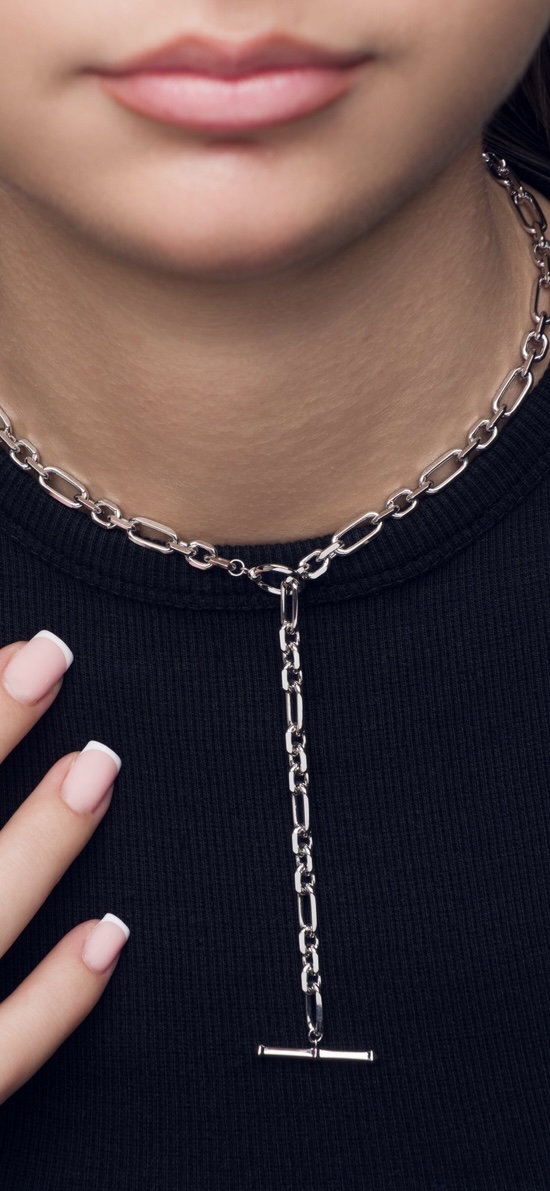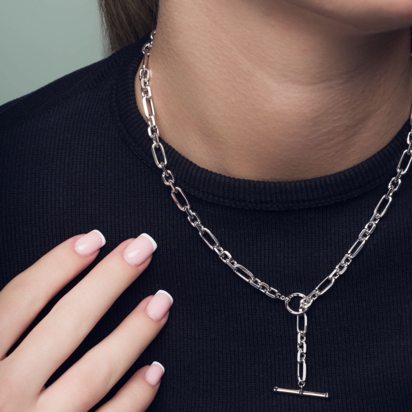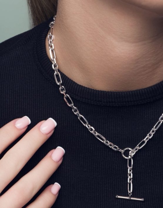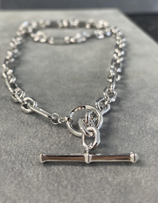 The multi link design complements the t-bar fastener to add detail to this chunky and stylish design.