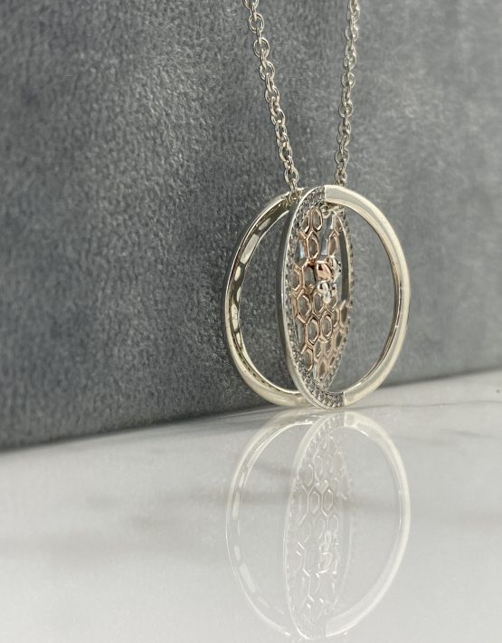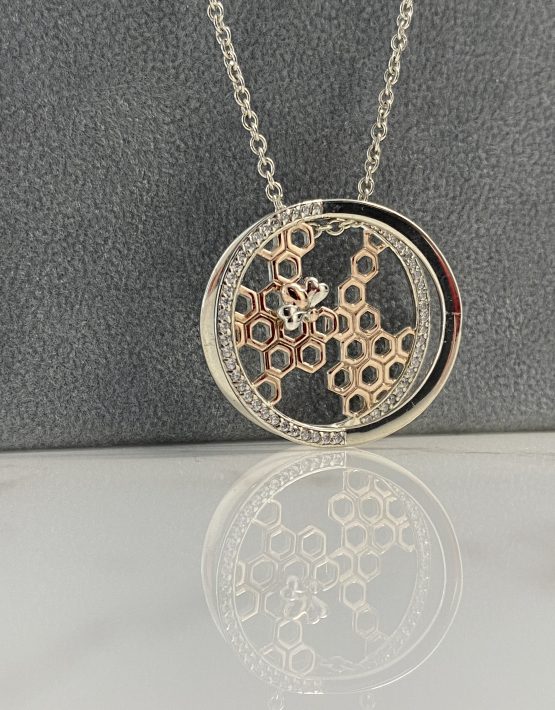 In a circular 3D design featuring 18ct rose gold plating honeycomb design alongside cubic zirconia detail on either edge of the 3D design.